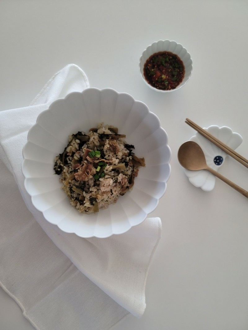 湯気が立ち上る熱々のうちに、器に盛り付けます。作っておいた特製ヤンニョムジャンを添えて、ご飯に混ぜながら食べれば、その美味しさは格別です。ご家族みんなで楽しめる、栄養満点で心も満たされるチャドルバギと大根の葉の炊き込みご飯、ぜひお召し上がりください!