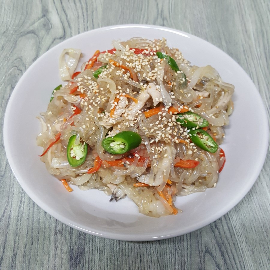 じゃーん!これで美味しいチャプチェの完成です。色とりどりの野菜と具材、そしてもちもちの春雨の組み合わせは格別です。温かいうちに召し上がると、より一層美味しくいただけます。特別な日には、心を込めて作ったチャプチェで、素敵な食卓をお楽しみください!