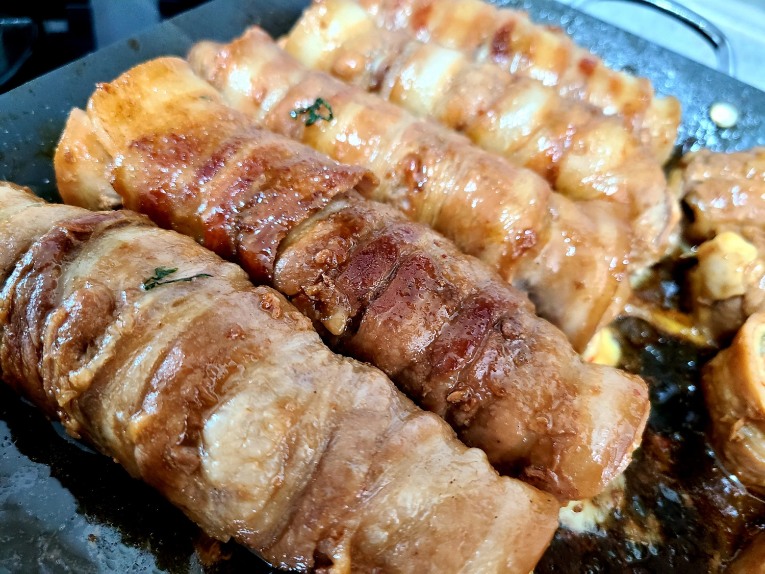 大きめのフライパンを中弱火でしっかりと熱し、キムチ巻きサムギョプサルを並べます。火力が強すぎると表面だけが焦げて中まで火が通らなくなることがあるので、火加減に注意しながらじっくりと焼いてください。