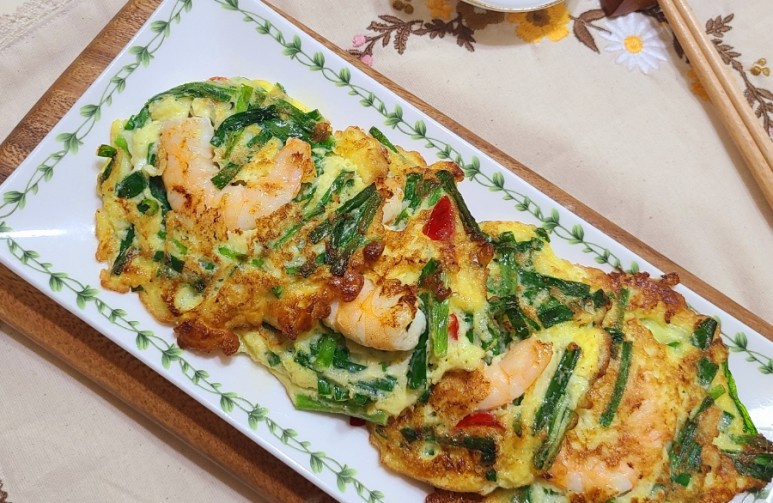 焼きあがったニラとエビのチヂミは、お皿に盛り付けます。熱々が一番美味しいです。甘めのタレを添えると、さらに風味が引き立ちます。醤油に酢を数滴たらして軽くつけて食べると、香ばしさとともに旨味も深まります。お子さんのおやつにする場合は、唐辛子を抜いて作ると、辛さ控えめで美味しく楽しめます。