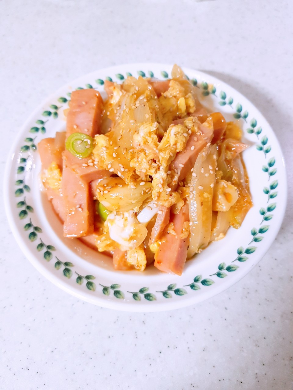 最後に、小口切りにした長ねぎを加えて全体をさっと混ぜ合わせれば、ハムと卵炒めの完成です。長ねぎのみずみずしい香りが加わり、味のバランスを整えてくれます。