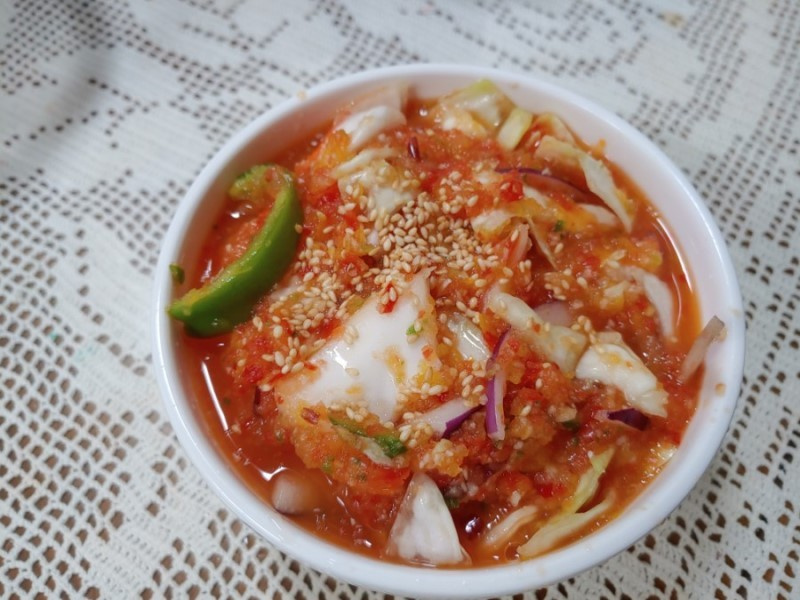 美味しく熟成したパプリカとキャベツの水キムチの完成です! 新鮮な野菜の旨味と、爽やかなスープが絶妙にマッチし、健康的で美味しい一食が完成します。まるで元気が出る薬膳料理のように感じられる、ヘルシーな一品をぜひ味わってみてください。♥