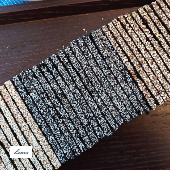 炒めたナッツをすぐに海苔の上に乗せ、ゴムベラやヘラを使って、できるだけ素早く、そして広く平らに伸ばしてください。できるだけ薄く伸ばすと、後で切りやすくなり、食感も良くなります。その上に、もう一枚の海苔をザラザラした面を上にして重ねます。海苔が二枚重なり、内側の面同士がくっつきます。