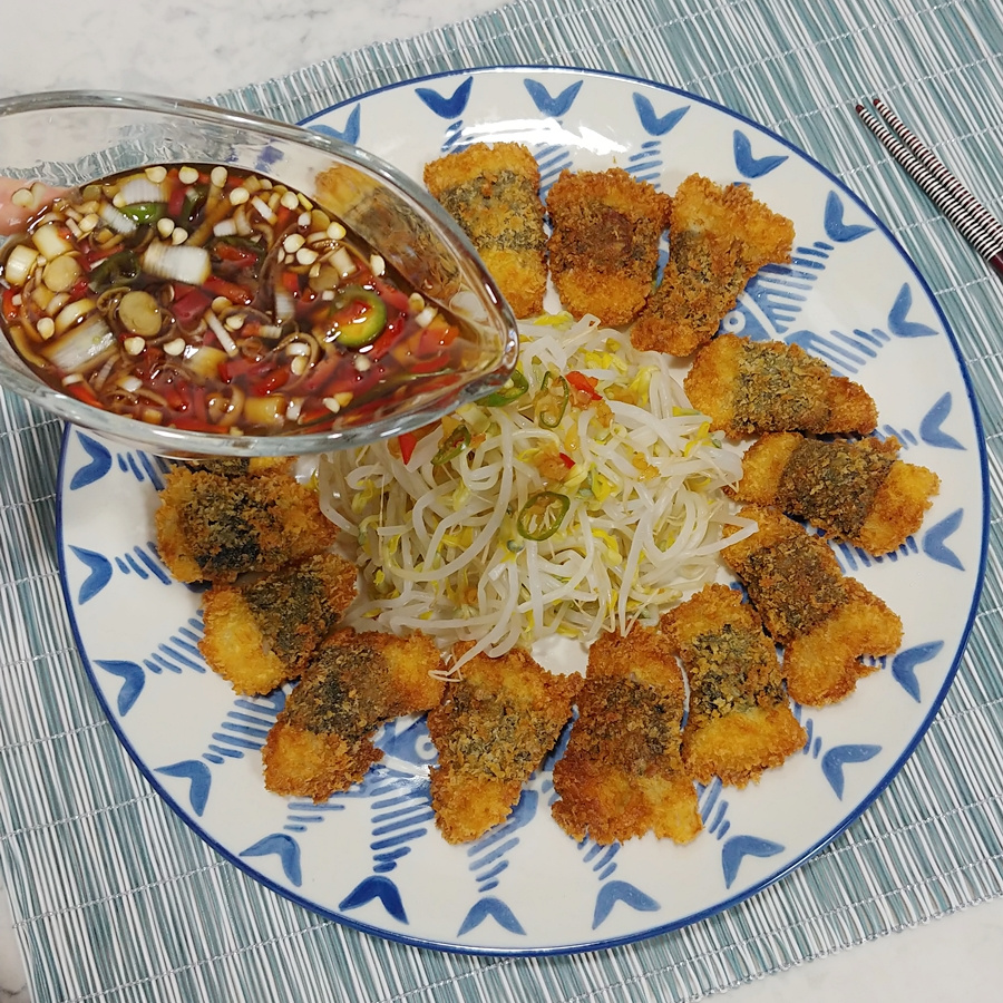 [おうちで簡単!本格ごはん] 海苔で巻いた鱈のフライ添え、自家製豆もやしナムル