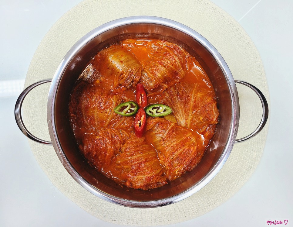 キムチを緩すぎないように、豚肉がはみ出さないようにしっかりと巻くことが重要です。しっかり巻くことで、煮込んでいる間に形が崩れるのを防ぎます。