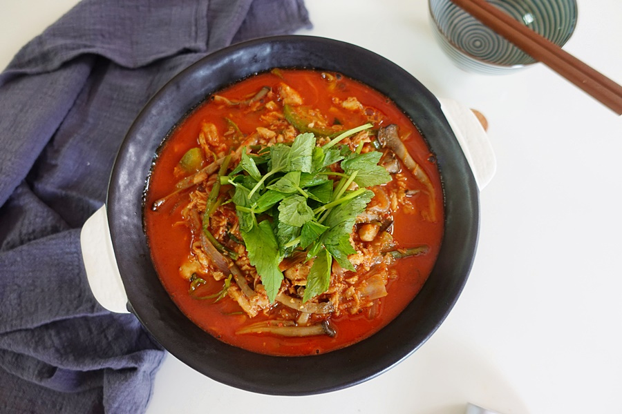 スープが煮立ったら、デンジャン大さじ1、コチュジャン大さじ1、コチュカル大さじ2、そしてニンニクのみじん切り大さじ1/2を加えて、調味料を溶き混ぜます。それぞれの材料がダマにならないように、よく混ぜてください。