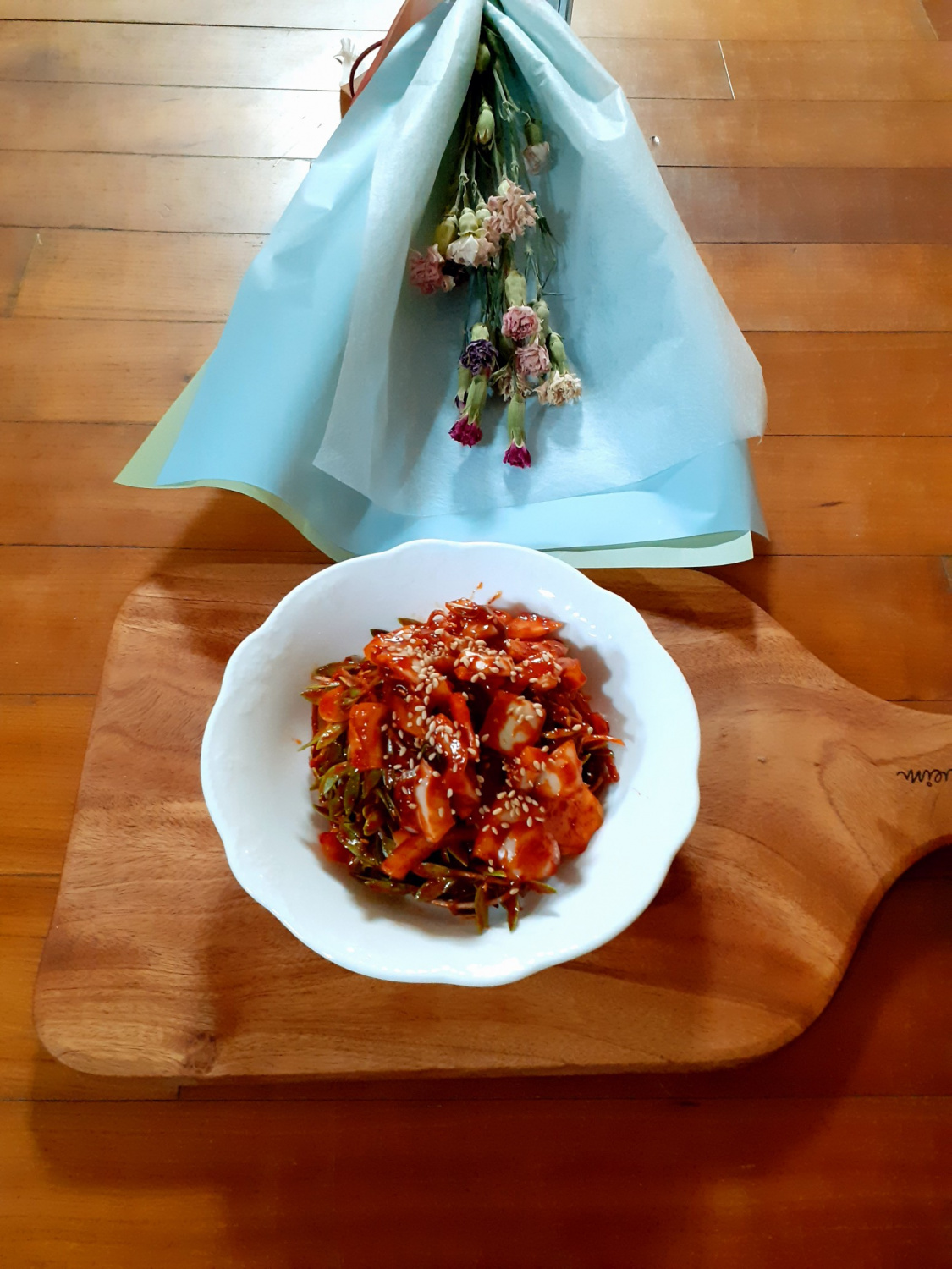 甘酸っぱくピリ辛な味がたまらない、ドンナムルと玉ねぎの和え物の完成です!お皿にきれいに盛り付けると、さらに美味しそうに見えますよ。新鮮なドンナムルのシャキシャキ感と玉ねぎの甘み、そして甘酸っぱくピリ辛な調味料が絶妙に調和し、ご飯がどんどん進む美味しさです。ぜひ今すぐ作ってみてください!