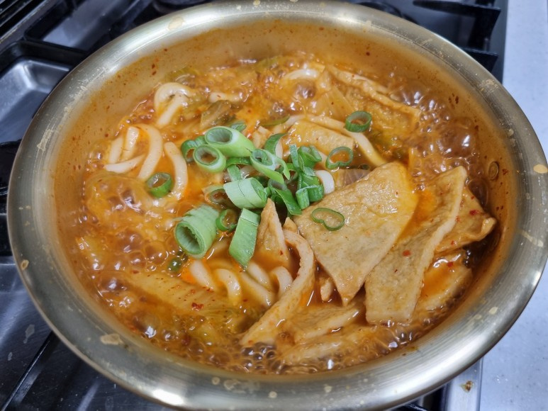 最後に、刻んだ長ネギを加え、ひと煮立ちさせたら火を止めます。うどんがちょうどよく茹で上がり、スープの味も整ったら完成です。ピリ辛で美味しいキムチうどんの出来上がり!