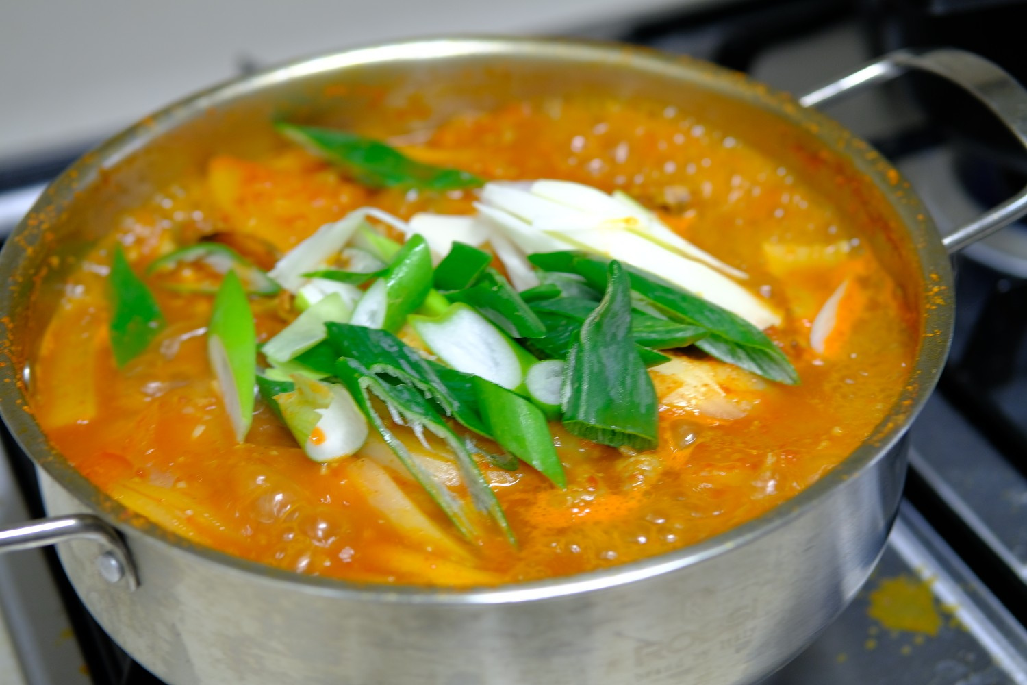 鶏肉と大根がある程度火が通ったら、準備しておいた玉ねぎと斜め切りにした唐辛子を加えます。玉ねぎの甘みと唐辛子のピリッとした辛さが、タッポクンタンの風味を一層引き立ててくれるでしょう。