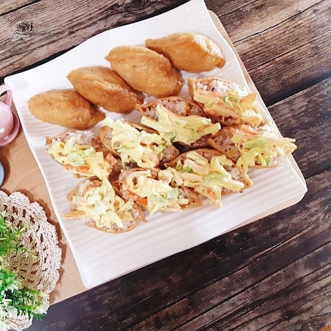 油揚げの袋に寿司飯を適量詰め込み、その上に先ほど作ったカニカマと青唐辛子のマヨネーズ和えをたっぷりとのせてください。彩りも美しく、味も抜群です!