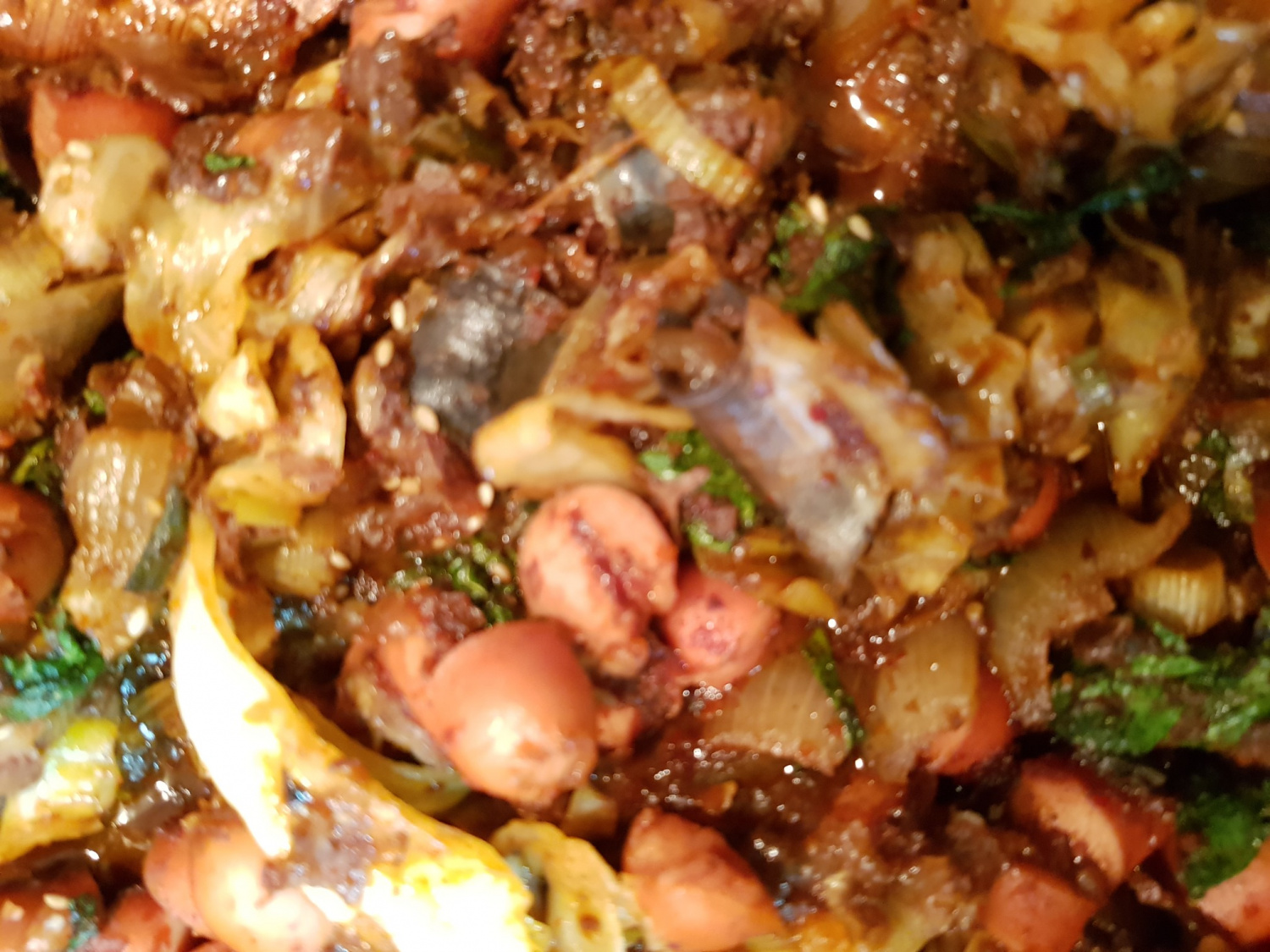ピリ辛甘口!スパムとスンデの炒め物:食卓が華やぐ一品