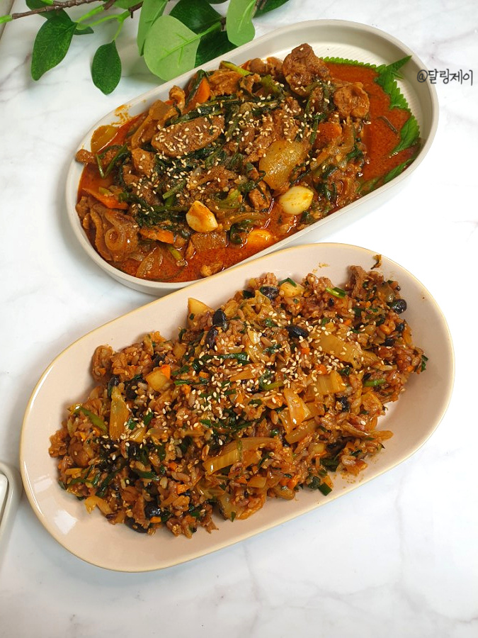 5分経って蓋を開けると、鴨肉は完全に火が通っているはずです。ここで準備しておいたニラとエゴマの葉パウダー(すりごま)大さじ2を加え、火を弱火にして2〜3分間さらに炒めます。弱火で炒めることで、タレが程よく煮詰まり、風味が凝縮されます。最後に火を止め、ごま油大さじ1と白ごま少々を加えてよく混ぜ合わせれば、美味しい鴨プルコギの完成です!辛いのがお好きな方は、お好みで青唐辛子を薄切りにして一緒に炒めても美味しいですよ。