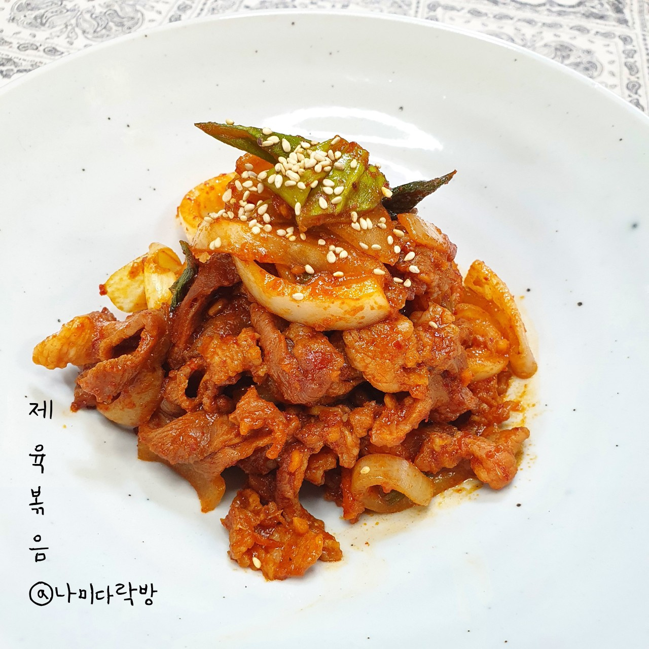 美味しく炒めあがったジェユクボックンを、お皿にきれいに盛り付けたら完成!温かいご飯の上に乗せて、サンチュなどの葉物野菜と一緒に食べると、さらにボリューム満点で美味しくいただけますよ。