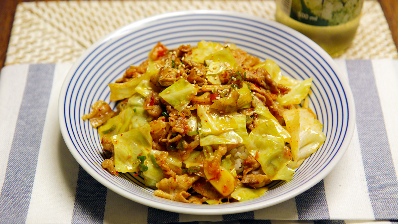 豚肉の表面の色が変わってきたら、切っておいたキャベツと長ネギを加えて、強火のまま野菜がしんなりするまで約2〜3分間さらに炒めます。この時、野菜が焦げ付かないように手早く炒めることが大切です。