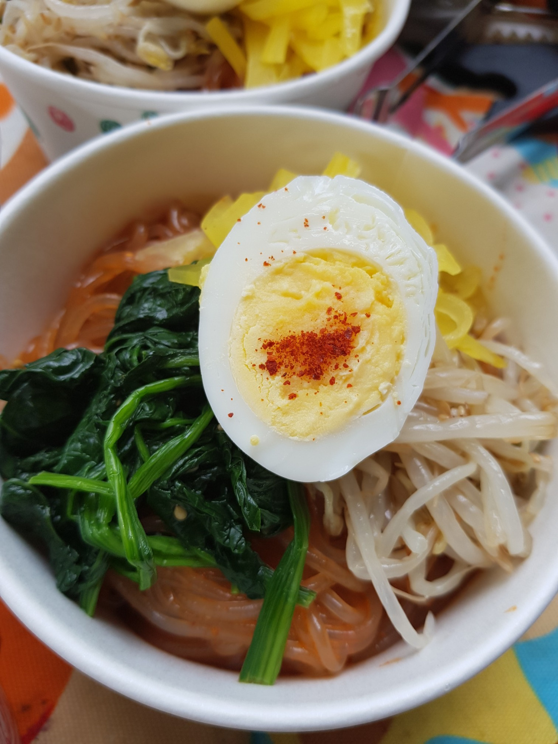 最後に、器に味付けしたタンミョンを盛り付け、その上に準備したほうれん草、もやし、細切りたくあんを彩りよく乗せます。そして、最後の「締め」として、ゆで卵を上に飾れば、美味しいビビンタンミョンの完成です!(お好みで、ゆで卵の上に一味唐辛子を少し振ると、見た目もさらに食欲をそそります。)