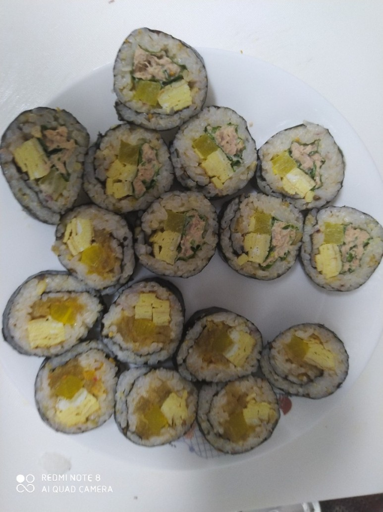 ツヤツヤと美味しそうなツナ青唐辛子キンパが完成しました!ピリ辛と香ばしさのハーモニーが絶妙です。