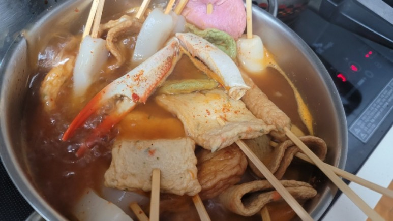 最後に、竹串に刺したおでん(オムク)を入れ、おでんが柔らかくなるまでさらに5分ほど煮込めば、美味しいピリ辛おでんの完成です!トックとおでんがよく絡み合うように煮込んでください。