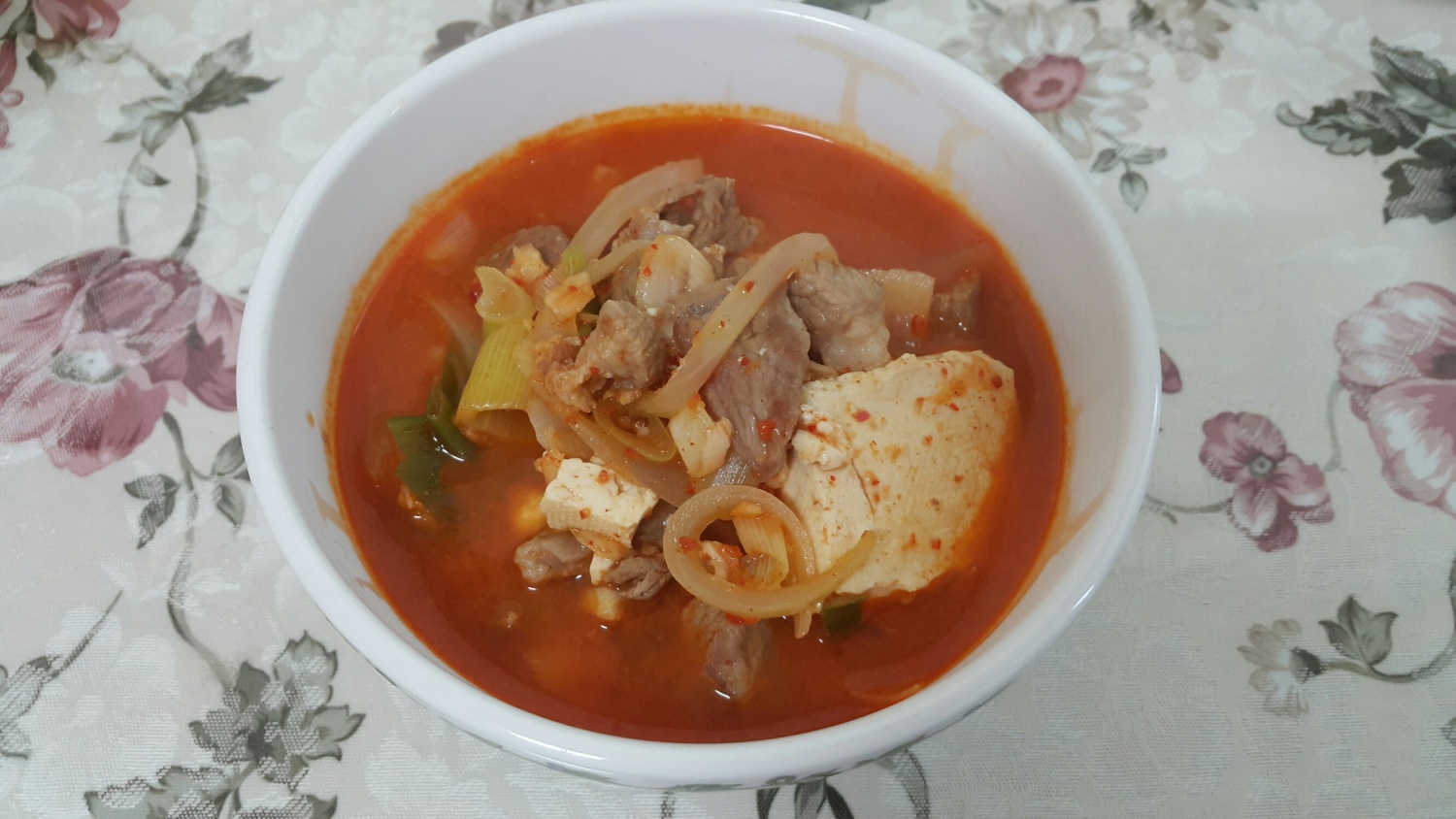 出来上がったピリ辛で美味しい豚肉とコチュジャンチゲを、温かいお椀に盛り付ければ、ボリューム満点の夕食の準備は完了です!