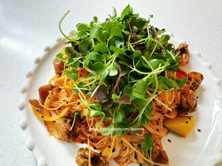 出来上がったつぶ貝そうめんを、美味しそうなお皿にたっぷりと盛り付け、準備しておいた新鮮なベビーリーフミックスをたっぷりと散らしましょう。彩りとフレッシュ感を加えます。