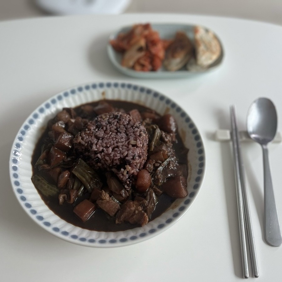 じゃがいもとにんじんがフォークで刺せるくらい柔らかくなったら蓋を開け、市販のジャジャンソースを加えて味を調えます。最初からたくさん入れるのではなく、少しずつ味見をしながら、お好みの濃さになるように調整するのがポイントです。ダマにならないよう、よく混ぜてください。