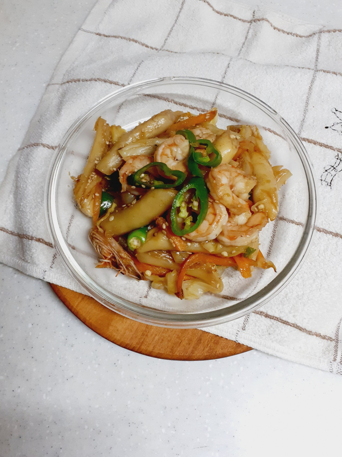 プリプリ海老たっぷり!特製甘辛醤油味のトッポッキ