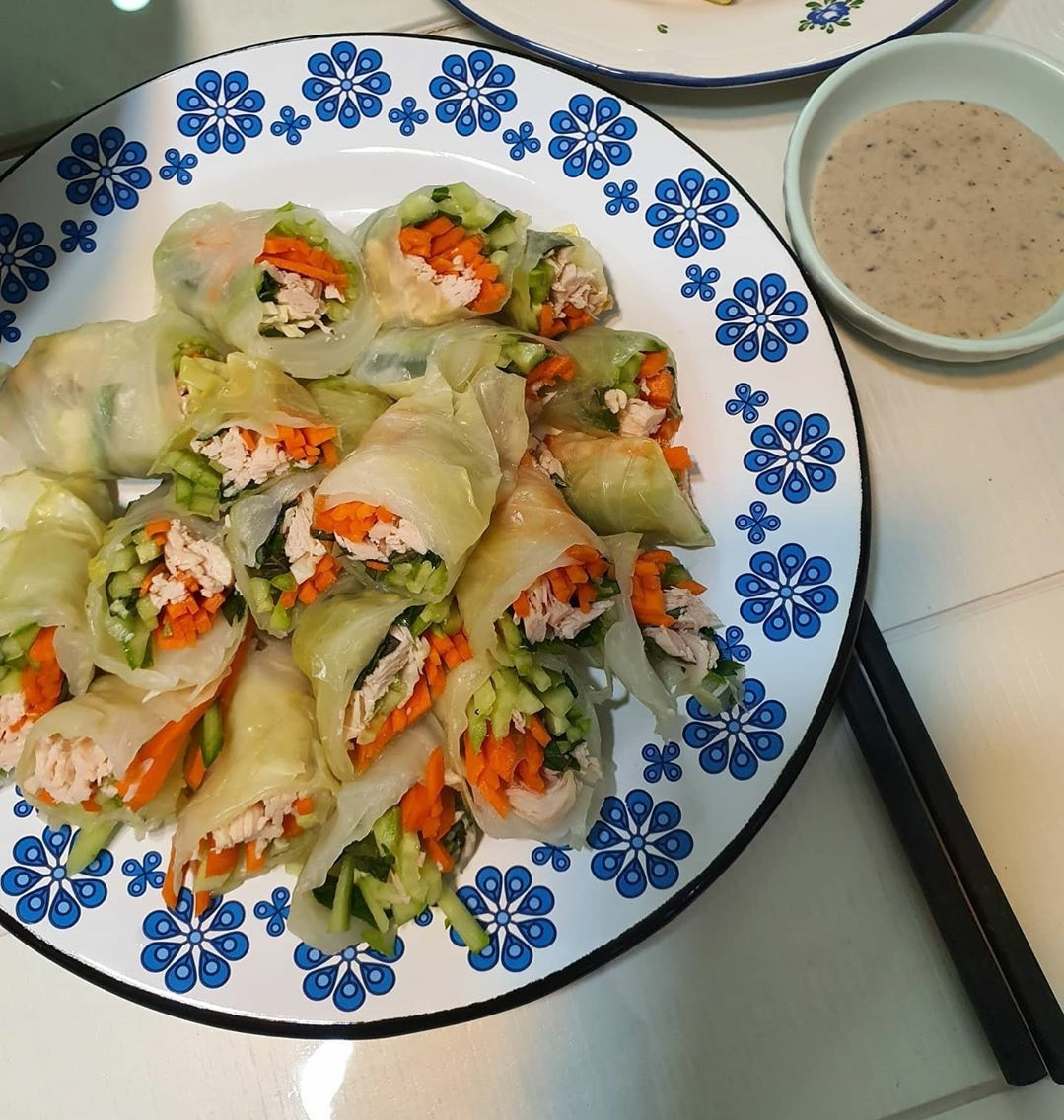 具材をすべて乗せたら、キャベツの葉で具材がはみ出さないように、しっかりとくるくると巻いていきます。食べやすい大きさに(約2~3cm)切って、お皿にきれいに盛り付けます。黒ごまソース、チリソース、またはお好みのソースにつけて食べれば、健康的で美味しい一食の完成です!満足感のあるダイエットメニューとしても、軽いおやつとしてもぴったりです。
