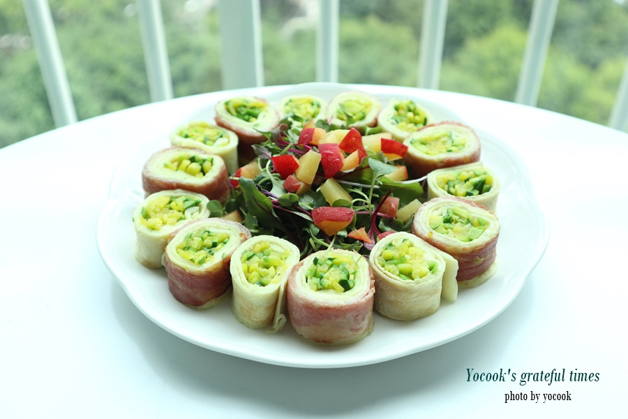 ここからはベーコンの出番です。ベーコン4枚を約0.5cm間隔をあけて平らに並べます。その上に、くるくる巻いたズッキーニ生地を乗せ、ベーコンでズッキーニ生地をもう一度、しっかりと巻き込みます。ベーコンは焼くと縮んでくっつくので、剥がれないようにしっかりと巻きましょう。