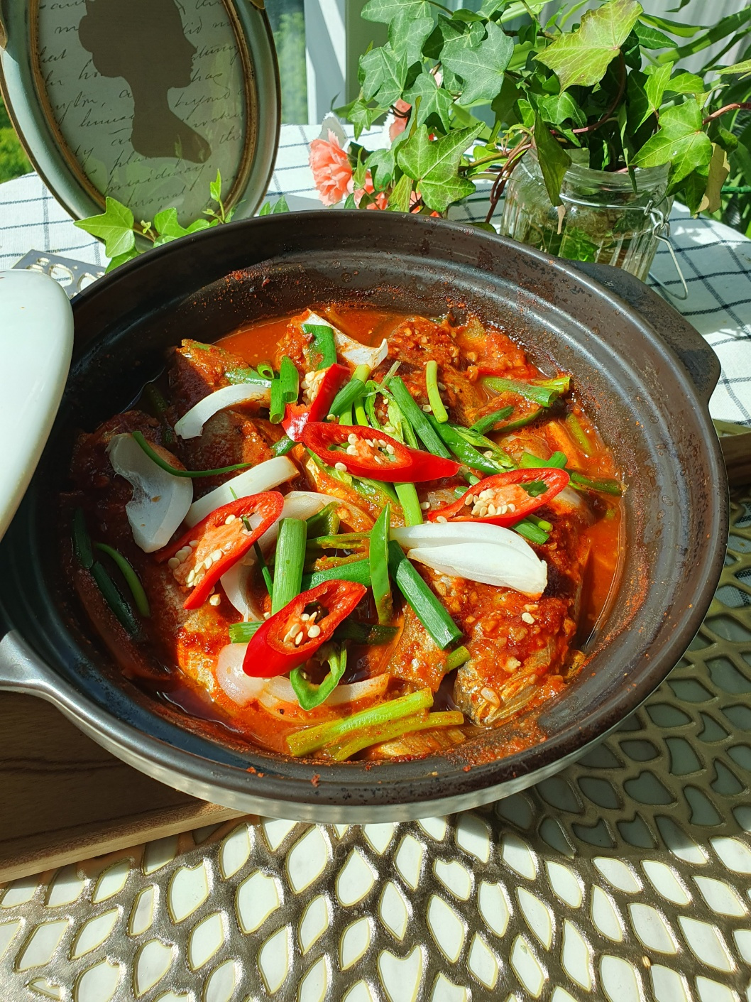 7. **野菜を加えて仕上げ**: キグチがほぼ火が通ったら、切っておいた長ネギ、青唐辛子、赤唐辛子、玉ねぎなどの野菜を加えます。蓋を開けたまま、さらに2分間煮込みます。野菜が軽く火が通り、煮込み料理の風味が増します。味見をして、もし薄ければ醤油を少し足し、甘みが足りなければ砂糖を少し加えて、お好みの味に調整してください。温かいご飯の上にのせて、美味しく召し上がれ!