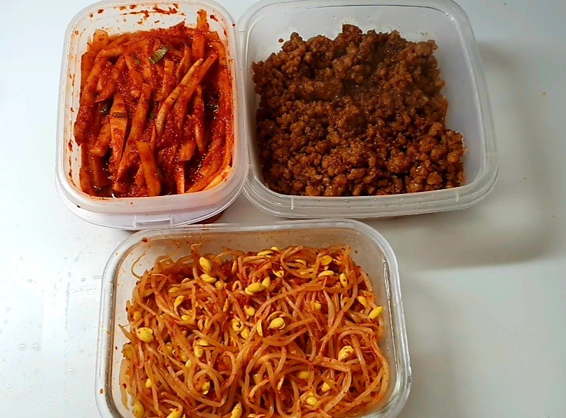 温かいご飯の上に、もやしのナムル、大根のナムル、そして豚肉の「マナニ」炒めをたっぷり乗せ、ごま油を少しかけるだけでも絶品です。お好みでツナ缶やコチュジャン(赤味噌)を加えても、ご飯が止まらなくなる、特別なビビンバが楽しめます!