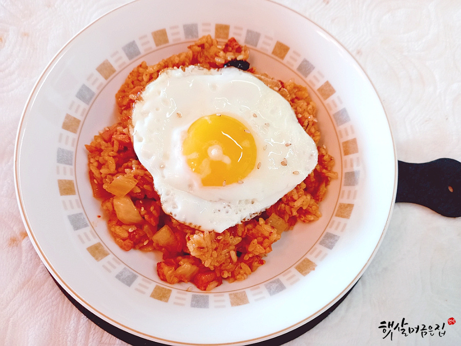 出来上がったスパムキムチチャーハンをお皿に盛り付けます。お好みで目玉焼きを半熟に焼いてチャーハンの上にそっと乗せると、見た目も味も完璧な一食が完成します。どうぞ美味しく召し上がってください!