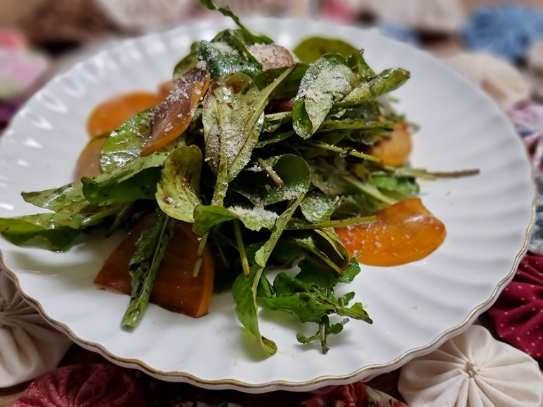 新鮮なルッコラのほろ苦さと、甘くてシャキシャキとした柿のピクルスが食欲をそそる、ルッコラサラダのレシピです。ルッコラはチーズとの相性が抜群で、今回は粉チーズを雪のように振りかけてみました。フレッシュチーズほどではありませんが、粉チーズだけでも十分なチーズの風味があり、とても満足感があります。簡単でありながら、特別な日や軽い食事にぴったりのメニューです。