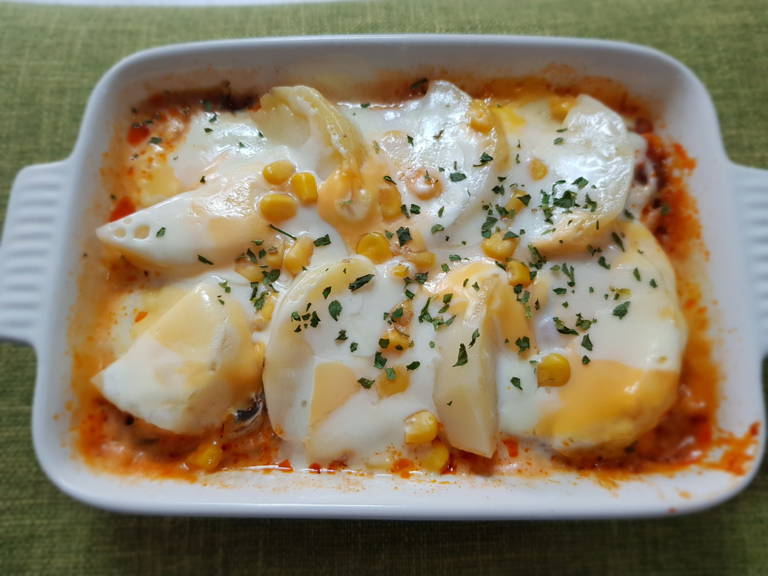 電子レンジから取り出すと、外は温かく、中はしっとり柔らかく、そしてモチモチとした食感がたまらない「食べるポテトピザ」の完成です!スプーンで美味しく召し上がれ!