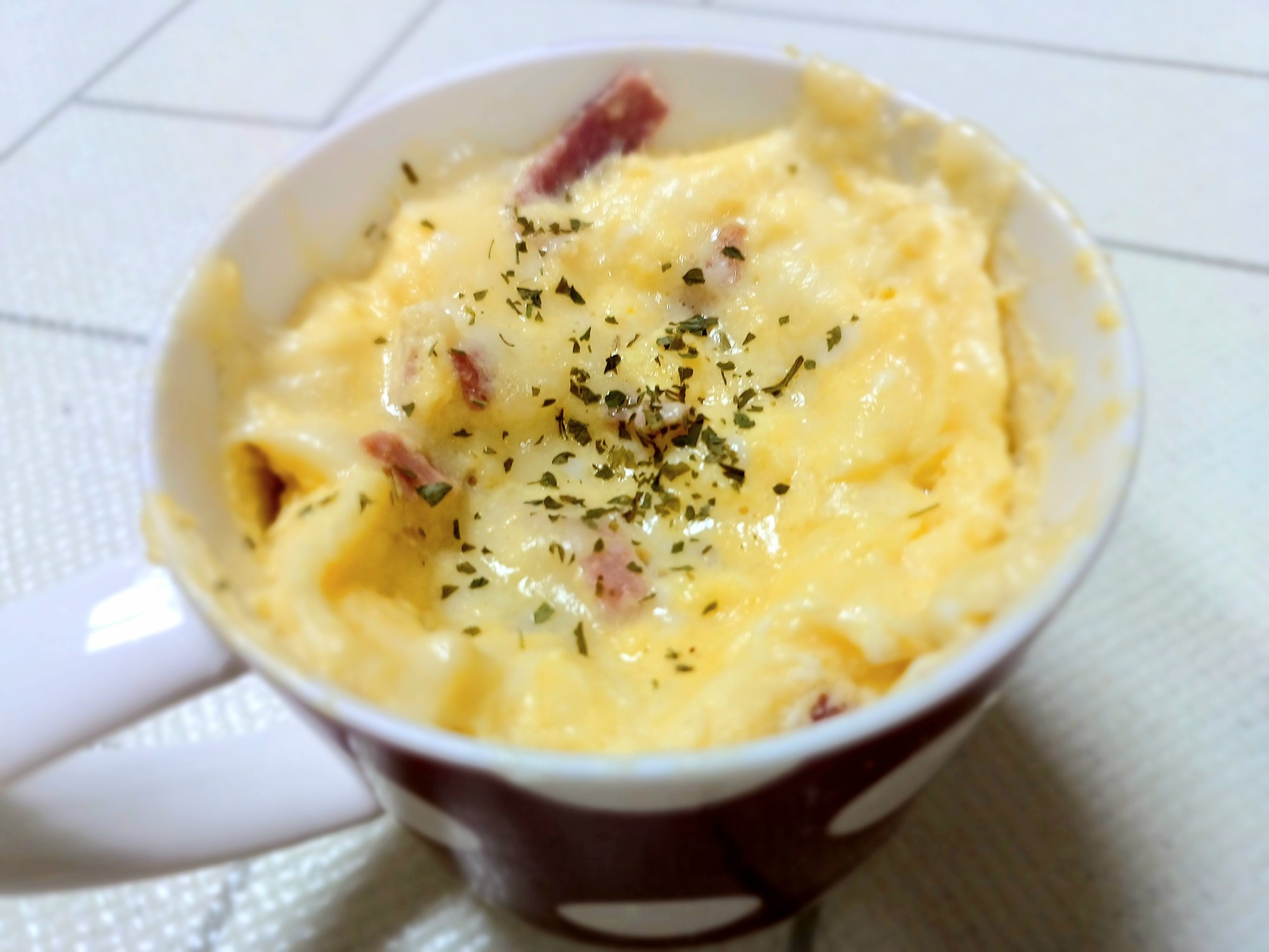 電子レンジで完成した、ふんわりと香ばしいベーコンチーズ卵蒸しに、お好みで乾燥パセリを散らすと、さらに美味しそうに見えます。温かいうちに召し上がれ!