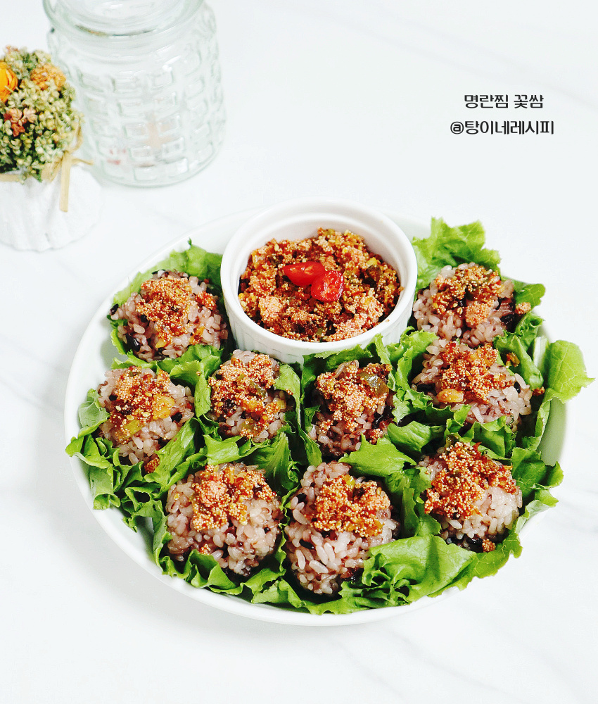最後に、電子レンジで調理した温かい明太子あんかけを、用意したご飯の包みの上に載せます。白ごまを軽く散らして仕上げると、見た目も美しく、味も抜群の、超簡単明太子あんかけ定食の完成です。どうぞ召し上がれ!