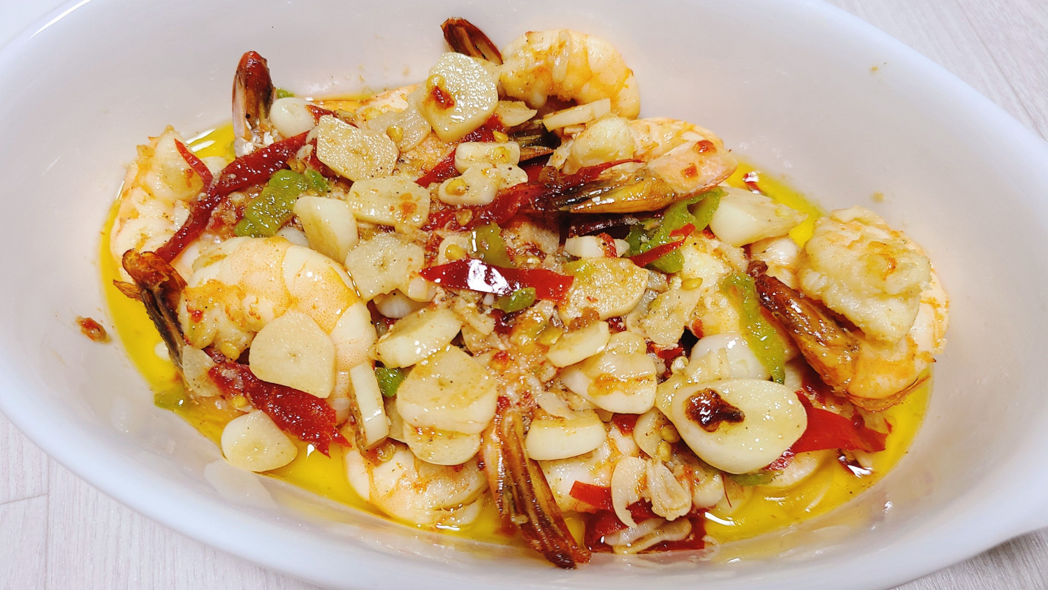 じゃーん!美味しい 청양고추(チョンヤンコチュ)の Гамбасの完成です。温かいバゲットと一緒に、たっぷりとお楽しみください!