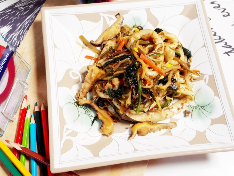 もちもちのブンモジャと、秋夕の残りナムルが調和したブンモジャチャプチェの完成です!タンミョンとはまた違う、ブンモジャ特有のプリッとした食感が魅力的で、様々なナムルと一緒に食べる楽しさがあり、さらに美味しくいただけます。特別な日には、残ったナムルを活用したユニークなチャプチェで、食卓を豊かに彩ってみてください!
