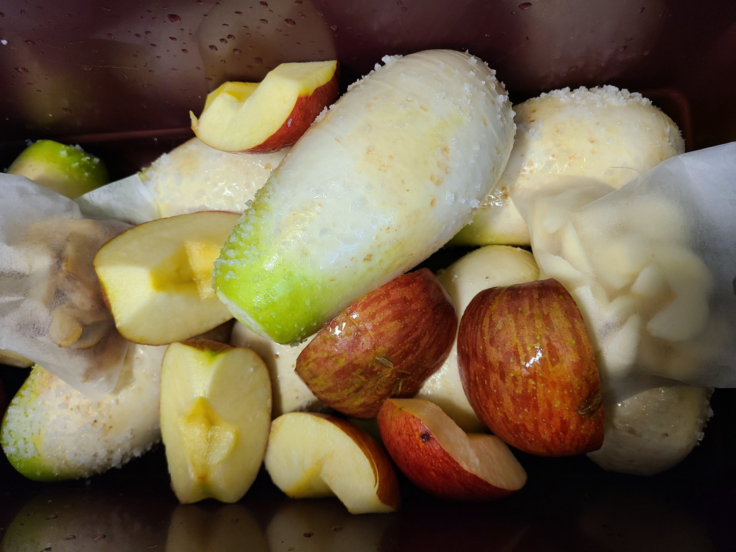 通常、大根は2日間ほどかき混ぜながら漬け込む必要がありますが、今回は出張のため時間がありません。「速成」で作ってみます!約2時間後には、大根についた塩がほとんど溶けていましたが、それでも最低4時間は大根を漬け込むのが良いでしょう。その後、切ったリンゴ、ニンニク、生姜をだしパックに入れます。軽く漬かった大根の上にこれを乗せます。