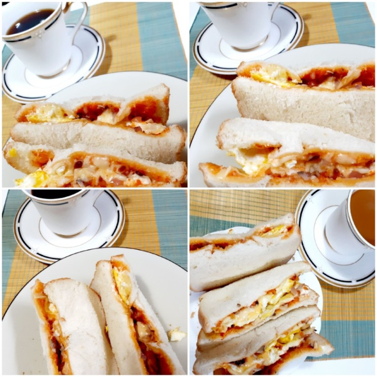 最後に、スクランブルエッグを乗せたピザパンの上に、もう一枚のピザパンをかぶせてサンドイッチの形を完成させます。これで美味しいピザパンサンドイッチの完成です!今日作ったパンは少し風味が濃厚なので、もし重く感じたら、さっぱりとしたピクルスと一緒に食べると、重たさが和らいでさらに美味しくいただけますよ。どうぞ召し上がれ!