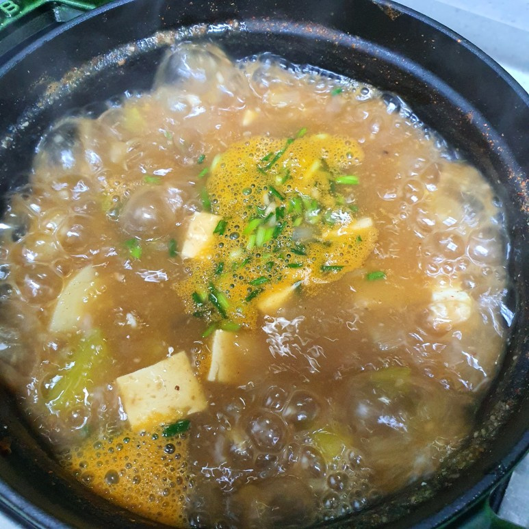 最後に、小口切りにしたネギを加えてひと煮立ちさせたら、美味しいデンジャンチゲの完成です!お好みで青唐辛子を少し加えると、ピリッとした辛みがアクセントになりますよ。