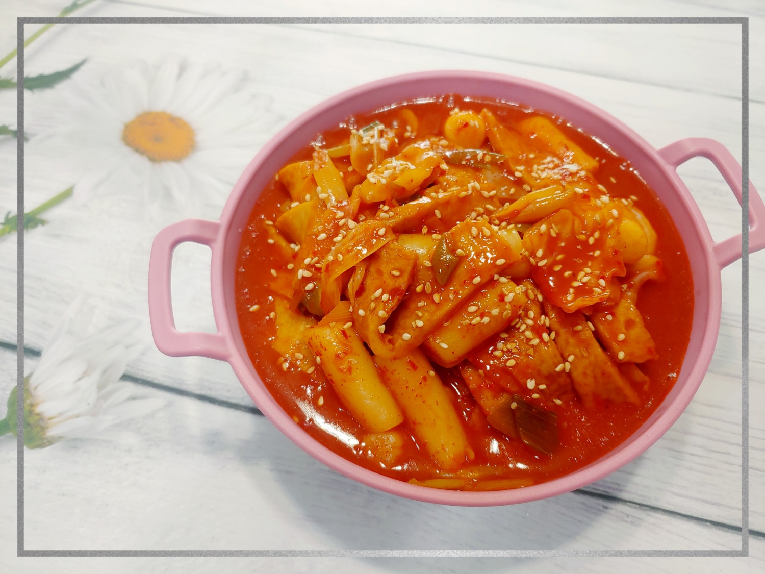 私が作ったトッポッキは、少し薄味に感じたため、うま味を加えるためにチキンスープの素小さじ1/2を、そして甘みと照りを加えるために水あめ大さじ1を追加しました。これらの材料は必須ではありません。味見をして、お好みで調整するか省略しても構いません。すべての調味料がよく馴染むように、最後に一度煮詰めれば、おいしいトッポッキの完成です!