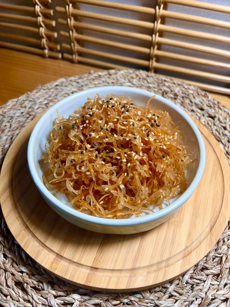 普通の乾燥イカよりもずっと柔らかい食感が自慢の乾燥イカのおかず、「イカの細切り甘辛炒め」をご紹介します。甘くてしょっぱい味付けで炒められ、子供たちも抵抗なく楽しめます。一度作っておけば、常備菜として、あるいは彩り豊かなお弁当のおかずとしてもぴったりです。調理法も簡単なので、誰でも手早く完成させることができます。コチュジャン味で作ることもできますが、今日は子供たちの味覚を捉える柔らかい醤油味バージョンをご紹介します。我が家で子供たちが一番気に入っているおかずの一つです。特有の生臭さを飛ばし、油でカリッと炒めた後、甘辛い味付けを加えてあっという間に完成する、美味しいイカの細切り甘辛炒めの作り方を順を追って説明します。