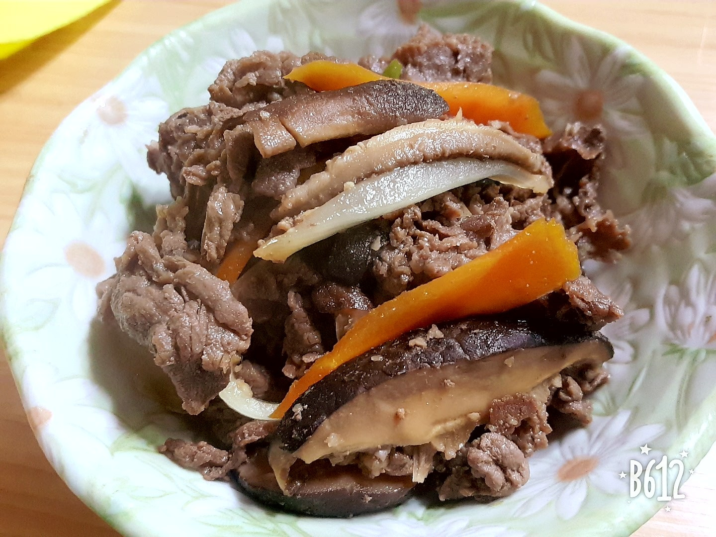 熱したフライパンに、漬け込んだ牛肉と、切った玉ねぎ、人参、戻した干ししいたけをすべて入れ、中火〜強火で炒めます。肉が固まらないように、菜箸でほぐしながら炒めるのがポイントです。炒める途中で、料理酒(みりんなど)大さじ2を加えると、肉の臭みがさらに取れ、風味が良くなります。肉と野菜に火が通り、タレが程よく煮詰まったら、最後に香りづけにごま油を数滴たらして火を止めます。温かいご飯に乗せて食べると、絶品です!