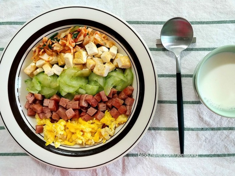 ご飯の上に、準備しておいた具材を彩りよく、あるいは好きな順に並べていきます。焼いた豆腐、ハム、スクランブルエッグ、水気を絞ったきゅうり、刻んだキムチをバランスよく乗せれば、彩り豊かな五色そぼろ丼の完成です。それぞれの具材の味や食感が合わさって、より一層豊かな食卓をお楽しみいただけます。