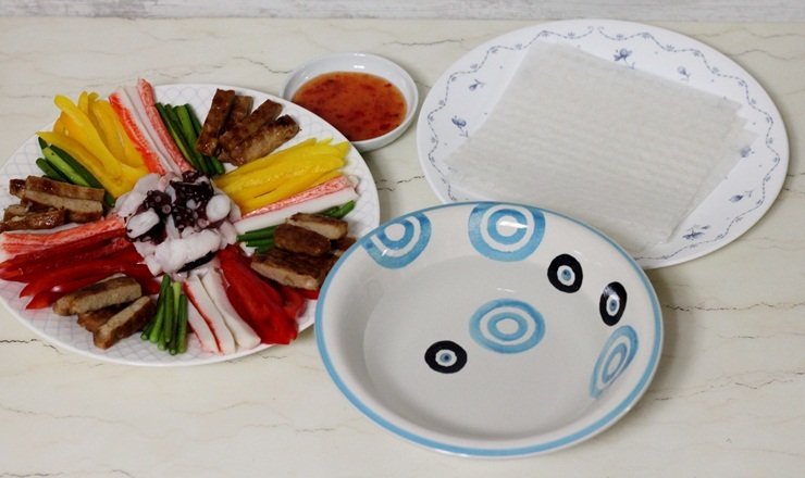 ライスペーパーは広げて置き、大きめの皿にぬるま湯を準備します。熱すぎるお湯はライスペーパーを破れやすくするので注意してください。
