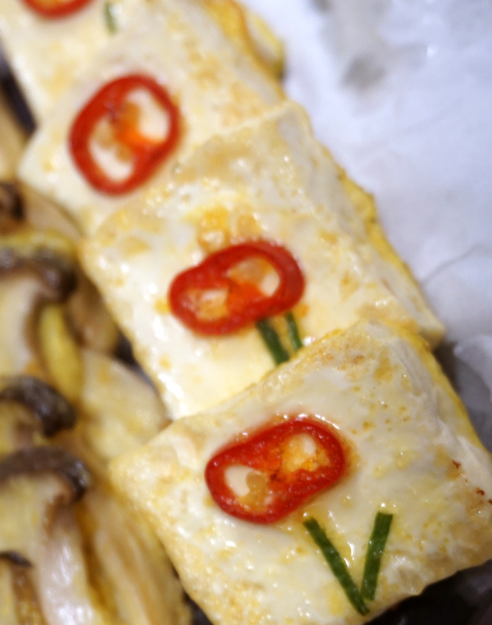 焼いている豆腐の上に、薄くスライスした赤唐辛子を乗せ、その上に切ったニラや小ネギを綺麗に飾り付けると、美しい花の形をした豆腐のチヂミが完成します。そのまま焼いても美味しい豆腐のチヂミですが、このように美しく飾ると、さらに特別な一品になります。どうですか、とても綺麗でしょう?