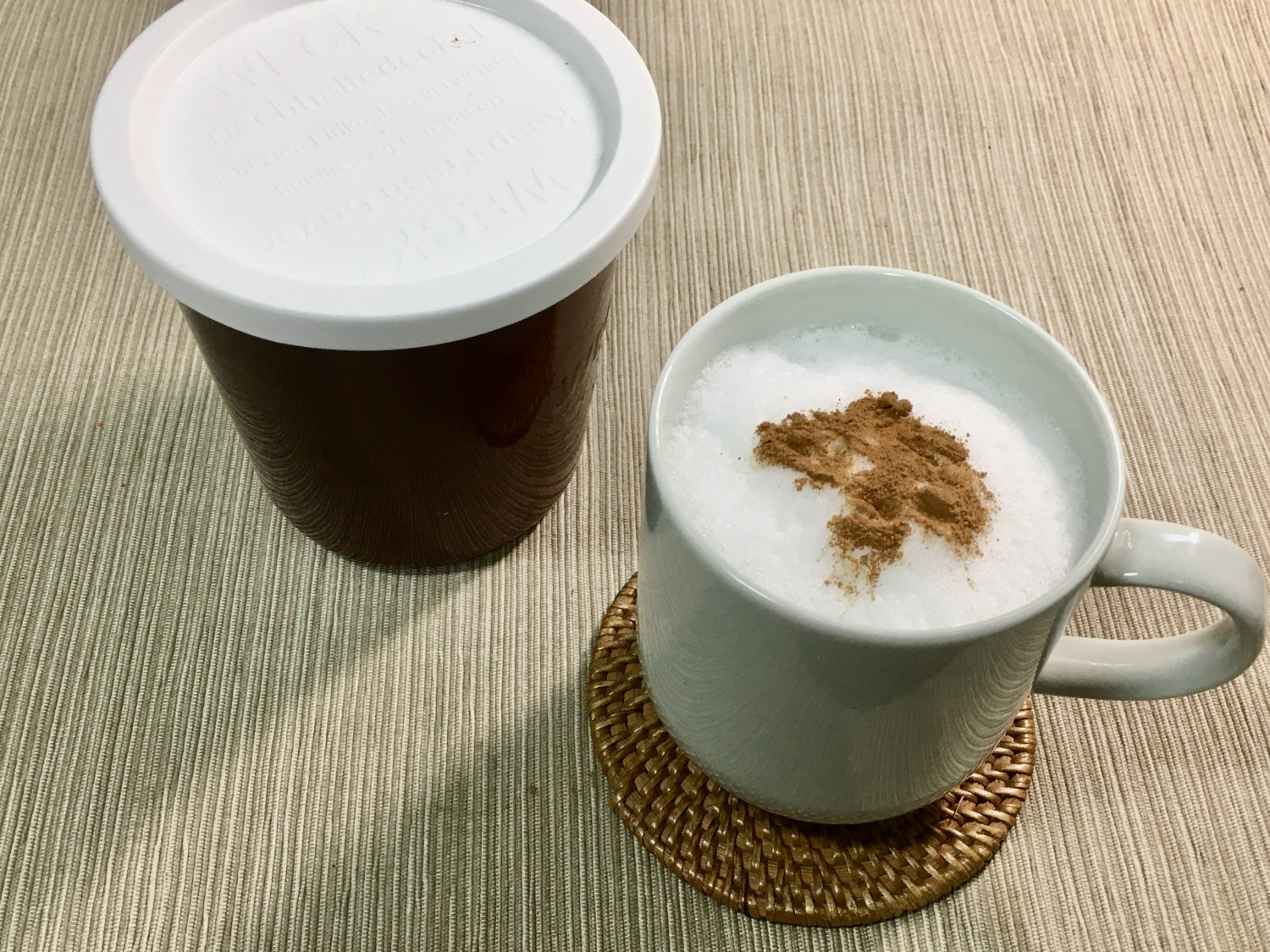 温かい牛乳は、電子レンジで約2分間温めてください。温めた牛乳をカップに注ぎ、準備した自家製ジンジャーシロップ小さじ2杯を加えてよく混ぜ合わせます。お好みでシナモンパウダーを軽く振りかけると、体が温まる美味しいジンジャーラテの完成です。