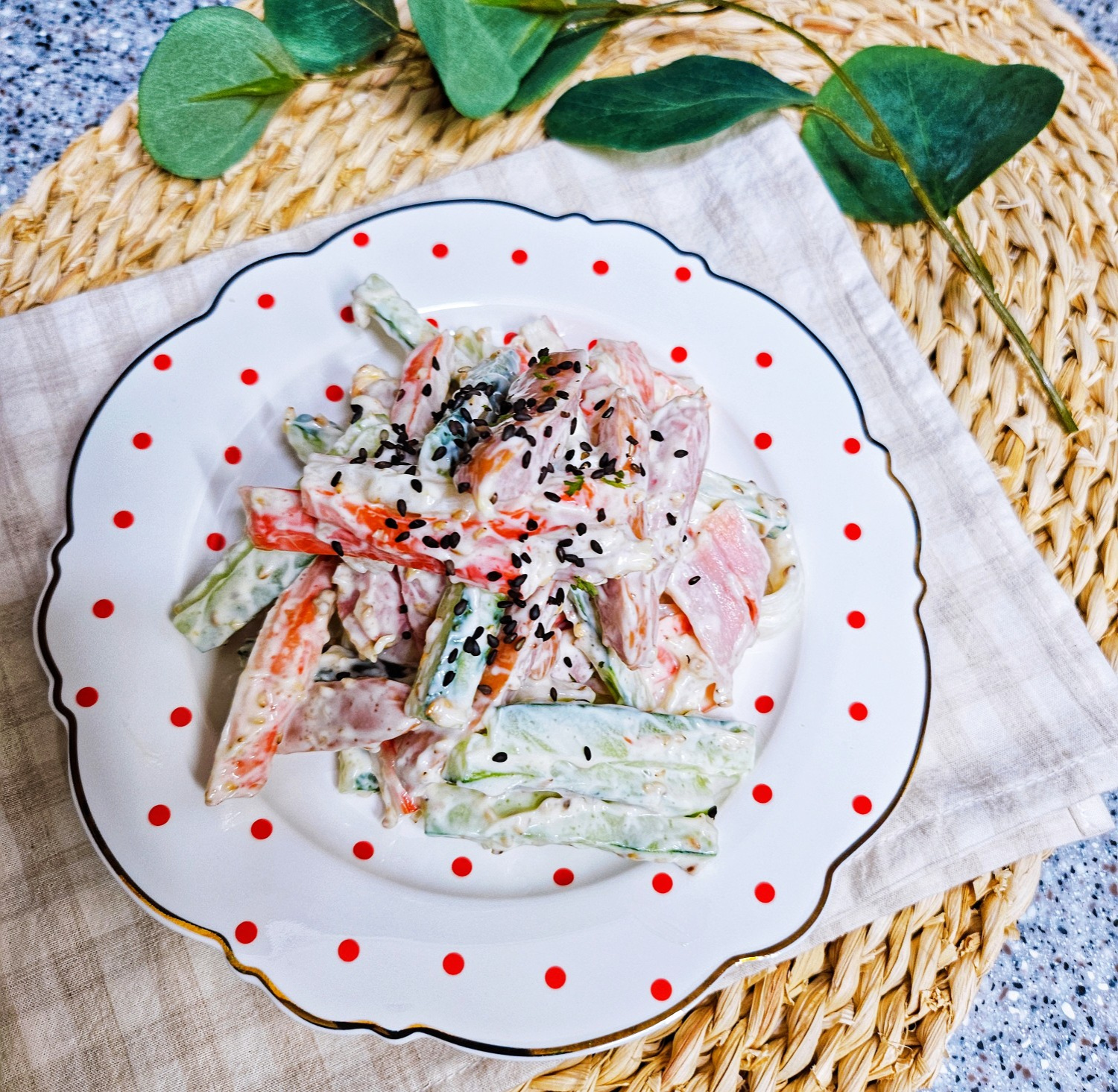 まずはサラダの主材料を準備しましょう。カニカマ4本、ウインナーソーセージ10本、そして新鮮なきゅうり1本を用意してください。