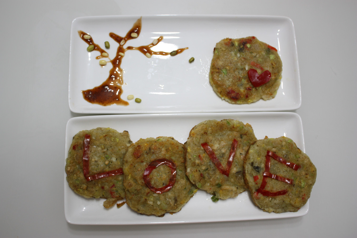 温かく焼いた緑豆チヂミの上に、メープルシロップと黒糖を混ぜたシロップで、秋らしい木の絵を描いてください。赤唐辛子を使って「L.O.V.E」の文字を飾ると、さらにロマンチックな雰囲気を演出できます。愛する夫のための特別な緑豆チヂミ、温かいマッコリ(韓国のお酒)一杯と共に過ごす、最高の秋の夜になるでしょう!