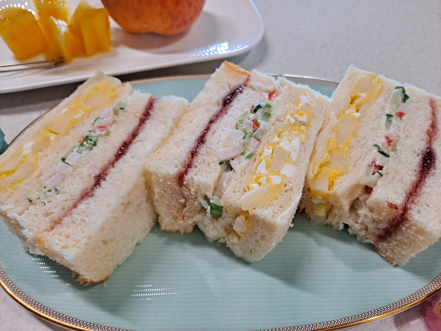 ジャムを塗った食パンの上に、じゃがいもと卵のサラダをたっぷりのせ、その上にきゅうり、玉ねぎ、カニカマのサラダを重ねます。最後に、もう1枚の食パンで挟み、サンドイッチの形を整えます。