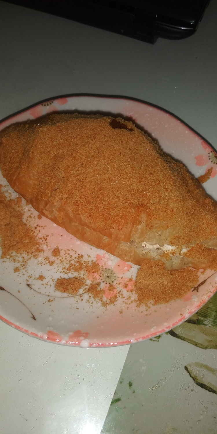 最後に、ダルゴナの魅力をプラスする時間です。ふるいを使って、残りのダルゴナ粉15gをクロワッサンの上にまんべんなく振りかけます。ふるいを使うと、粉がダマにならず均一に広がり、より美味しそうな見た目が完成します。甘くてサクサクのダルゴナクロワッサンの完成です!どうぞお召し上がりください。